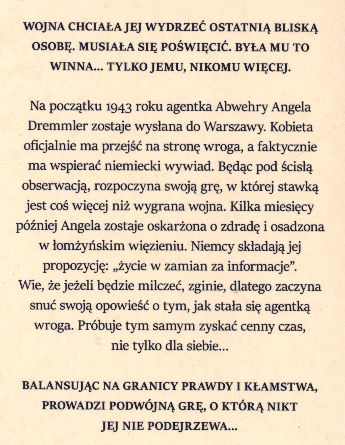 Abwehra, Okupacja niemiecka Polski (1939-1945), Podwójni agenci, Ruch oporu, Tajemnica, Łomża (woj. podlaskie), Warszawa (woj. mazowieckie), Powieść historyczna, Powieść obyczajowa, 1901-2000, 1939-1945