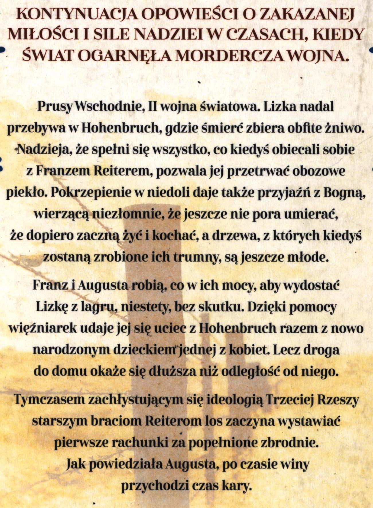 II wojna światowa (1939-1945), Miłość, Ucieczki więźniów, Niemieckie nazistowskie obozy koncentracyjne, Polacy, Niemcy (naród), Prusy Wschodnie, Warmia, Powieść obyczajowa, Saga rodzinna, 1901-2000, 1939-1945