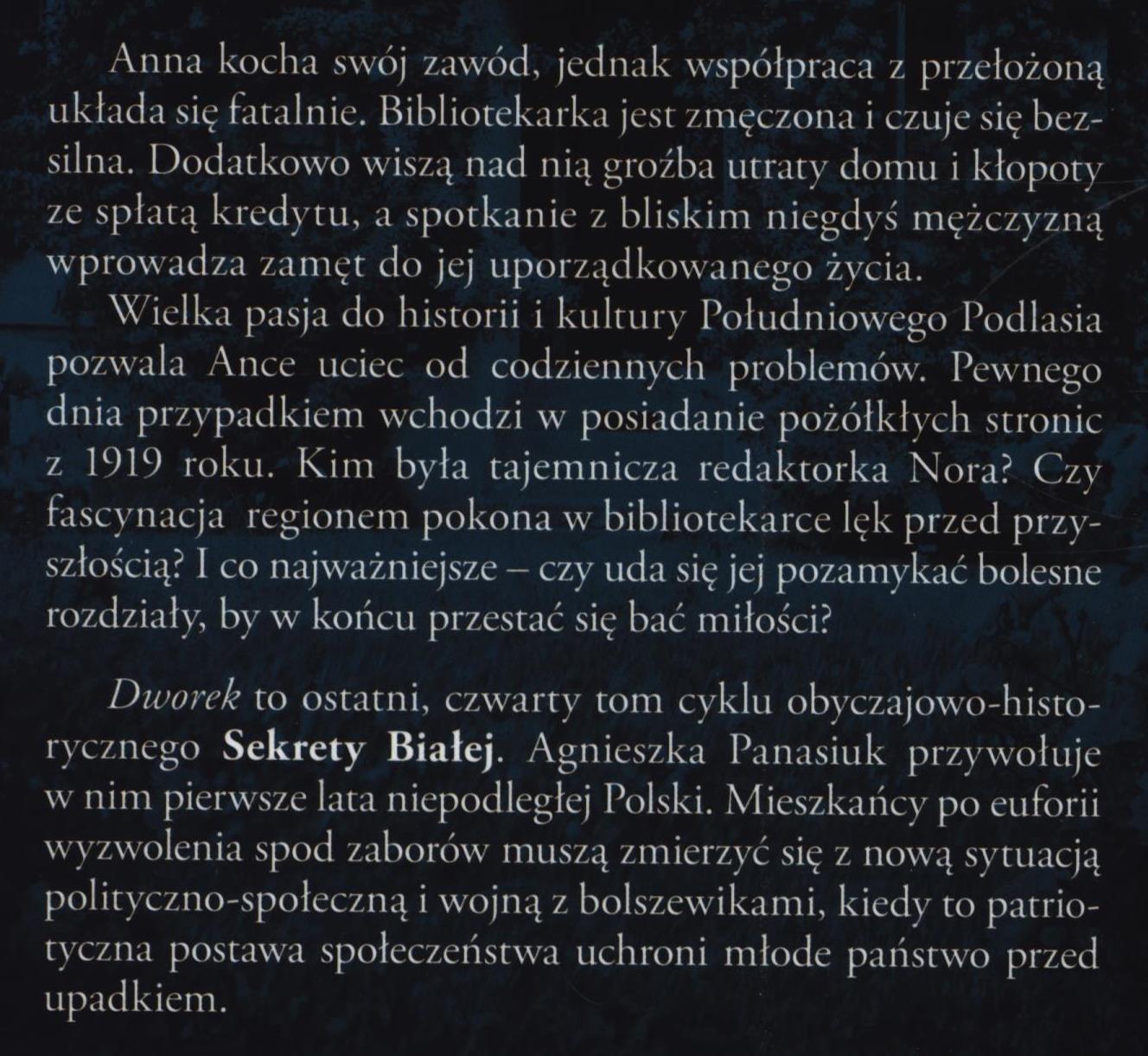Bibliotekarki i bibliotekarze, Miłość, Odzyskanie niepodległości przez Polskę (1918), Patriotyzm, Tajemnica, Trudne sytuacje życiowe, Biała Podlaska (woj. lubelskie), Powieść historyczna, Powieść obyczajowa
