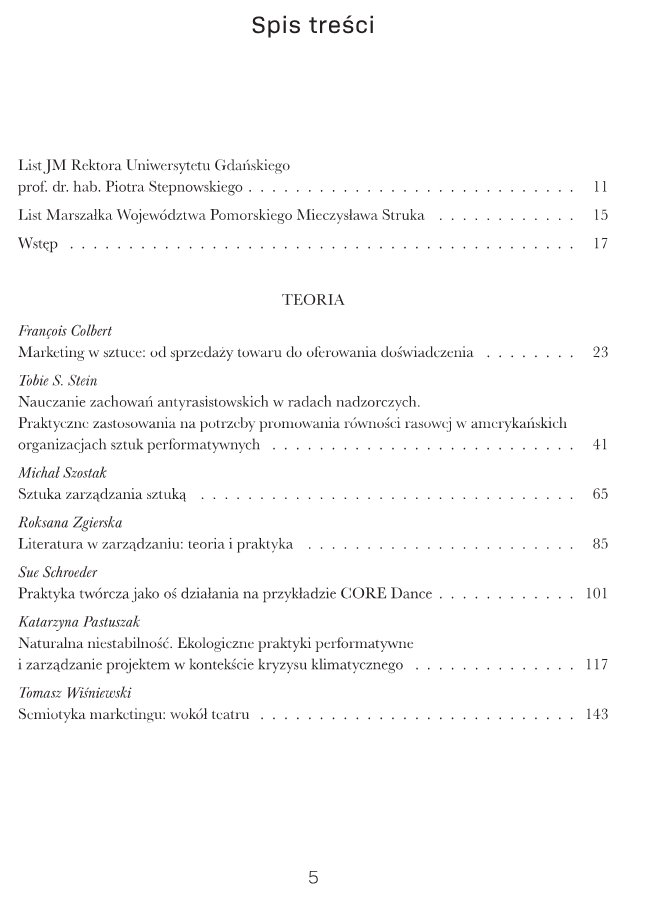 Książka koncentruje się na relacjach między sztuką a zarządzaniem i ekonomią, analizując m.in. strategie współpracy artystów z instytucjami i biznesem, finansowanie kultury, globalną dostępność treści artystycznych, festiwale jako formy organizacyjne, a także rolę teatru i literatury w budowaniu dialogu społecznego i międzykulturowego. [Nota wydawcy]