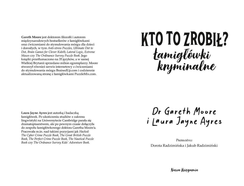 %a Wyzwól swoją wewnętrzną Pannę Marple i przygotuj się do dedukowania, kto to zrobił, w tym przewrotnym zbiorze zagadek kryminalnych. Przestępcy knują, a ty masz ich powstrzymać. Wytęż więc umysł, zmierz się z nikczemnymi przestępcami i rozwiązuj małomiasteczkowe tajemnice. Załóż czapkę detektywa i przekonaj się, czy masz dość bystry umysł, by schwytać sprawców, zanim spowodują jeszcze więcej kłopotów. Czekają cię różnorodne łamigłówki i zagadki logiczne. Ta książka wystawi twoje umiejętności rozumowania na prawdziwą próbę! Przygotuj więc sobie filiżankę herbaty, chwyć ołówek, otul się kocem i do dzieła! Gareth Moore jest doktorem filozofii i autorem międzynarodowych bestsellerów z łamigłówkami oraz ćwiczeniami do stymulowania mózgu dla dzieci i dorosłych, w tym "Anti-stress Puzzles," "Ultimate Dot to Dot" czy "The Ordinance Survey Puzzle Book". Jego książki przetłumaczono na 35 języków, a w samej Wielkiej Brytanii sprzedano milion egzemplarzy. Moore stworzył również serwis internetowy z ćwiczeniami do stymulowania mózgu i codziennie aktualizowaną stronę z łamigłówkami . Laura Jayne Ayres jest autorką i badaczką łamigłówek. Po ukończeniu studiów z zakresu lingwistyki na Uniwersytecie Cambridge parała się dramatopisarstwem, ale po pewnym czasie dołączyła do zespołu łamigłówkowego doktora Garetha Moore’a. Powyższy opis pochodzi od wydawcy.***https://platon.com.pl/prod/kto-to-zrobil-lamiglowki-kryminalne-zagadki-logiczne-9788310142733