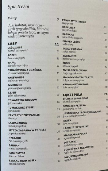 Na stronie 4 okładki : Na łamach tej książki zniesławiono 101 zwierząt, które możecie spotkać na lądzie, w wodzie oraz w waszych koszmarach. To tytuł dla miłośników fauny, którzy wiedzą, że prawdziwe uczucie wymaga wyrzeczeń, a niekiedy również maści na komary, odciski i ból czterech liter, kiedy człowiek słyszy bobra, ale zobaczyć go za cholerę nie może, bo mu przyroda złośliwie zasłania.
