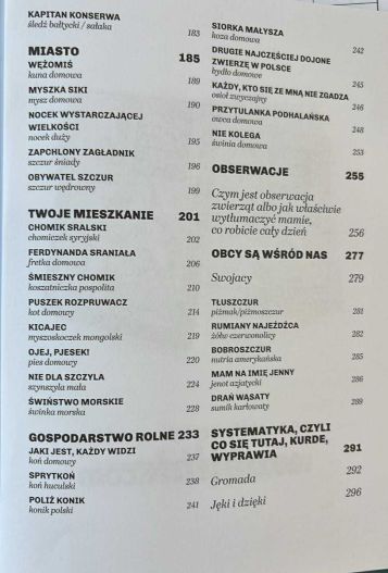 %a Na stronie 4 okładki : Na łamach tej książki zniesławiono 101 zwierząt, które możecie spotkać na lądzie, w wodzie oraz w waszych koszmarach. To tytuł dla miłośników fauny, którzy wiedzą, że prawdziwe uczucie wymaga wyrzeczeń, a niekiedy również maści na komary, odciski i ból czterech liter, kiedy człowiek słyszy bobra, ale zobaczyć go za cholerę nie może, bo mu przyroda złośliwie zasłania.